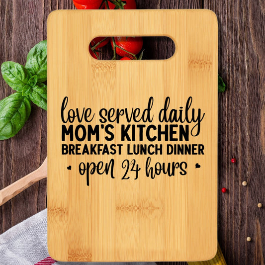 Love Served Daily Mom's Kitchen Breakfast Lunch Dinner Open 24 Hours Cutting Board